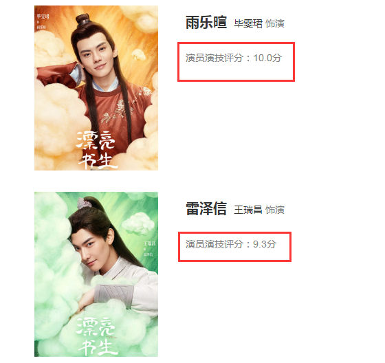 而男配毕雯珺的演技更是获得了10分,男三王瑞昌演技获得9.3分,算是整部剧的最低分。