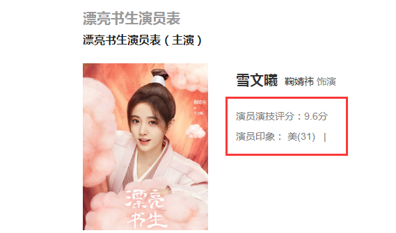 女主鞠婧祎演也被31人表示很美,还给她的演技打了9.6分。