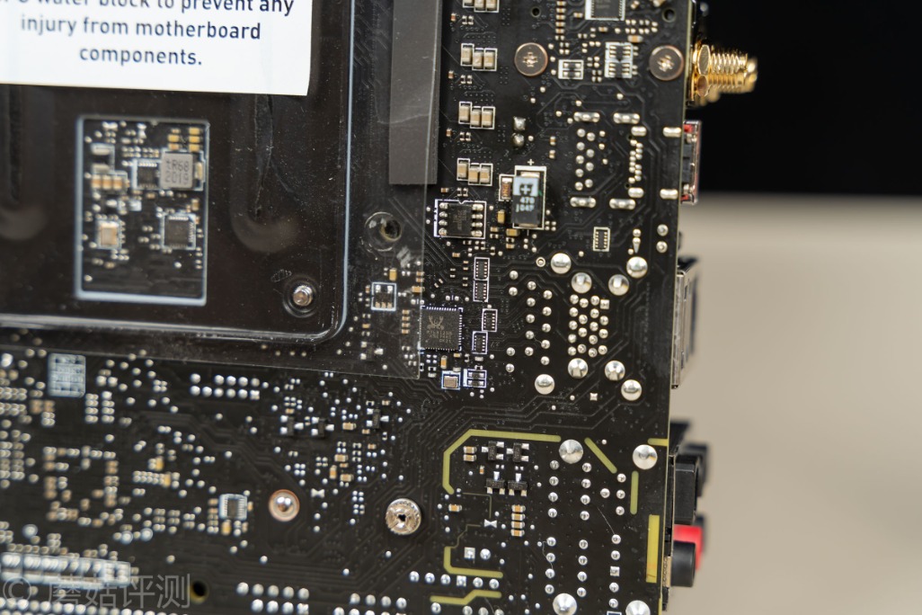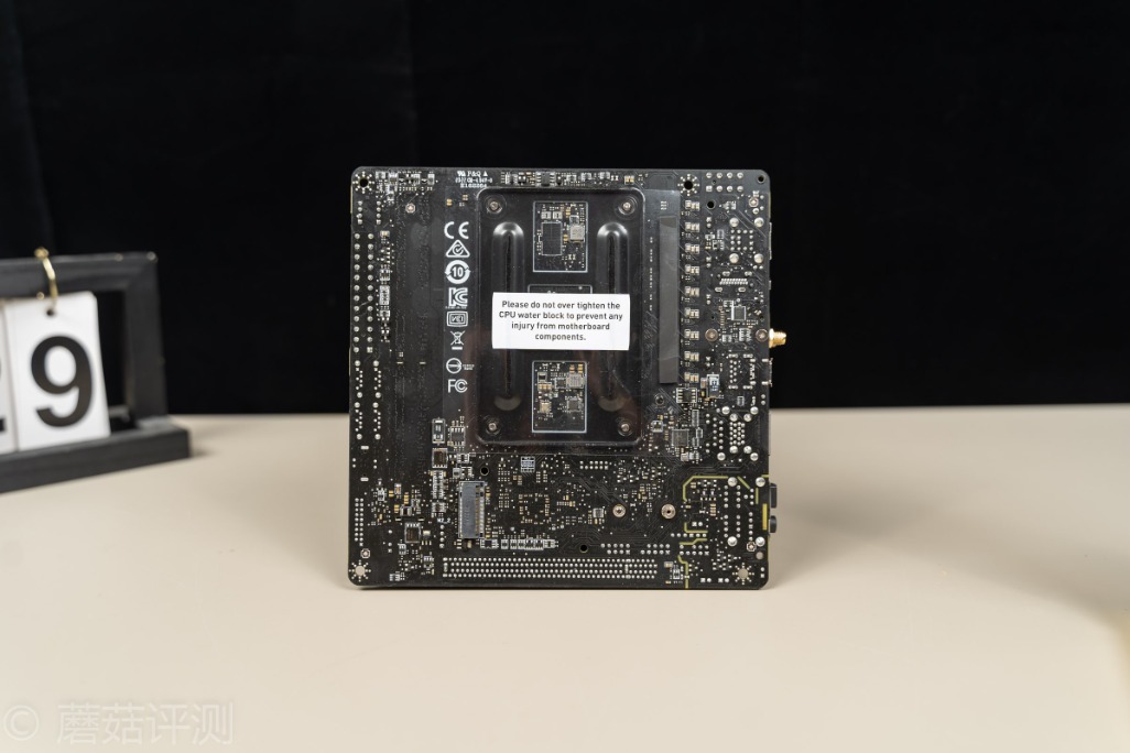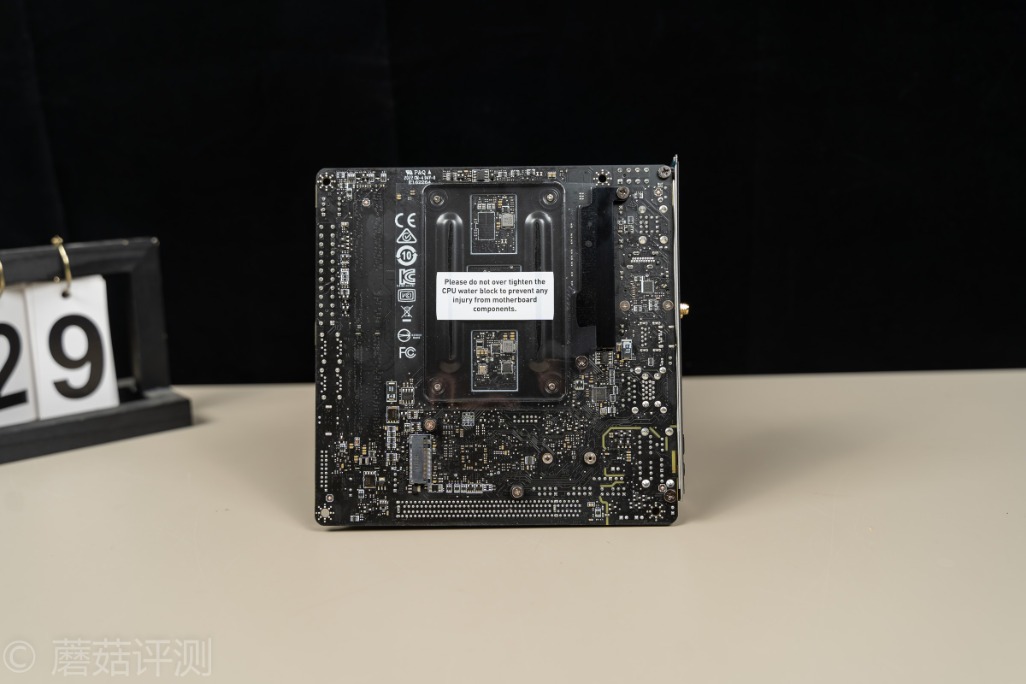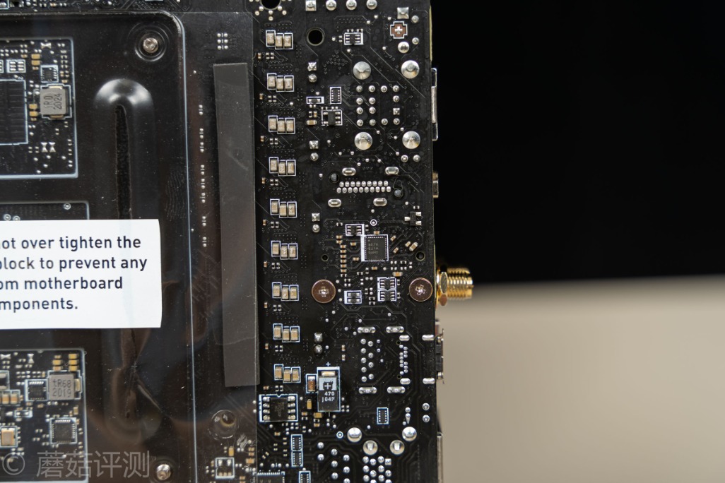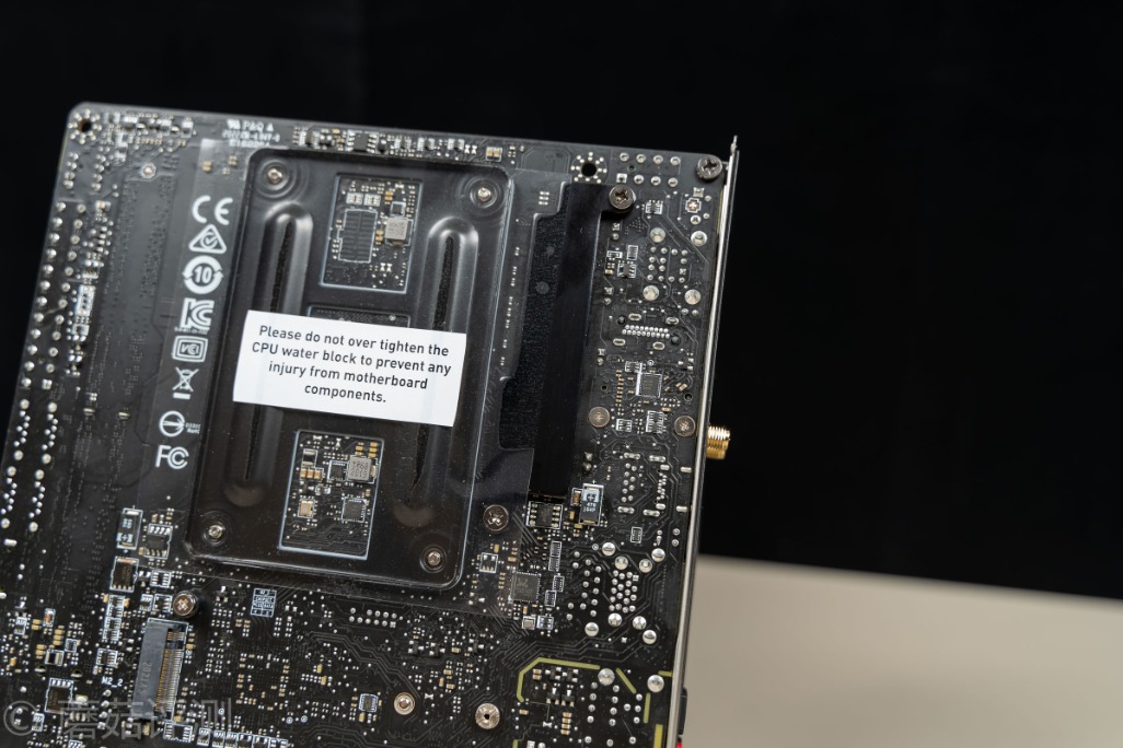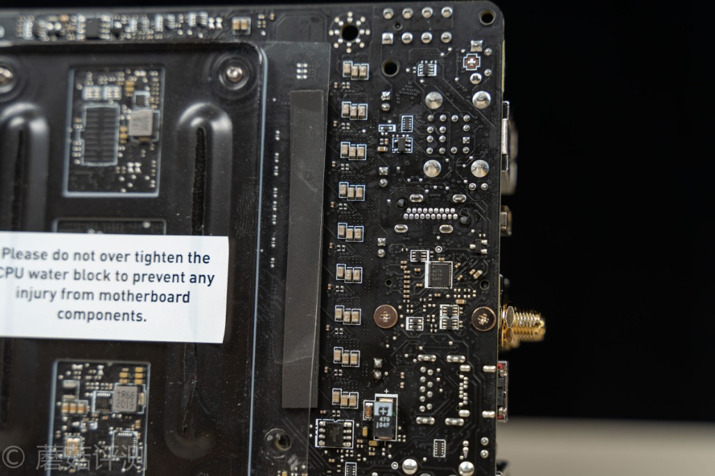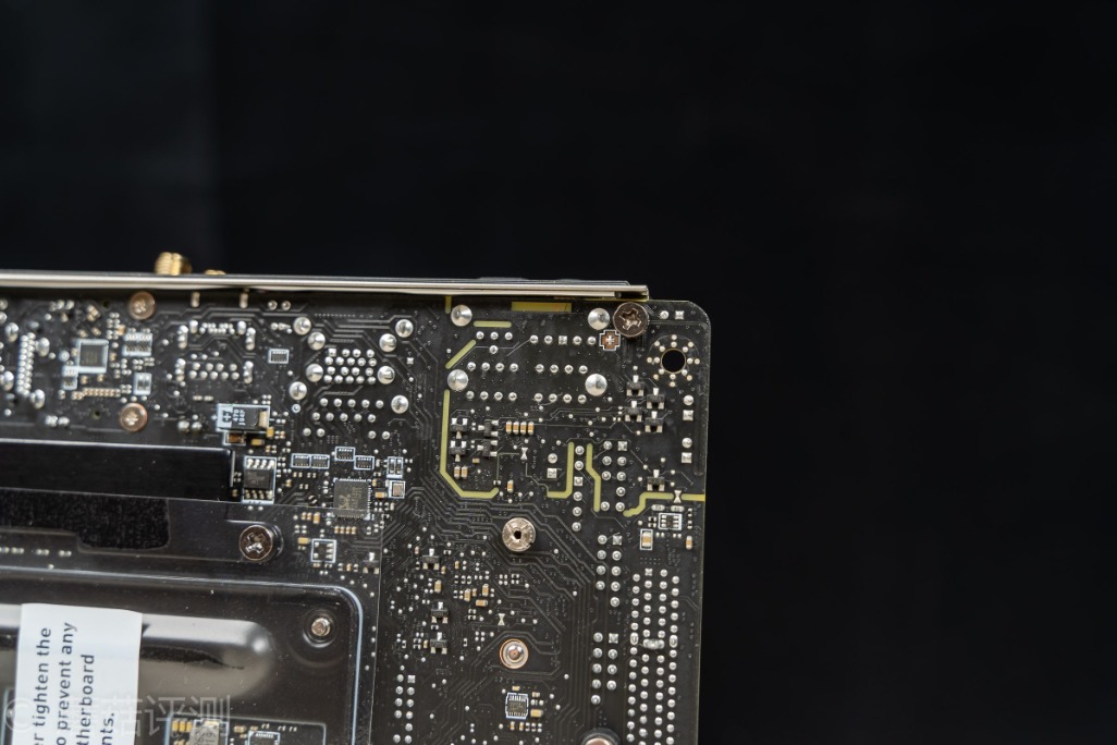 ▼主板的背面,有一张透明的贴纸,除了有绝缘保护的作用之外,这张纸上面还有一个小Tips,告诉我们固定散热背板的时候要注意力度。不过,我们看到微星这块B550I的主板原装金属背板是有点造型复杂的,孔洞里面好像还有多颗芯片、电感、电容之类的