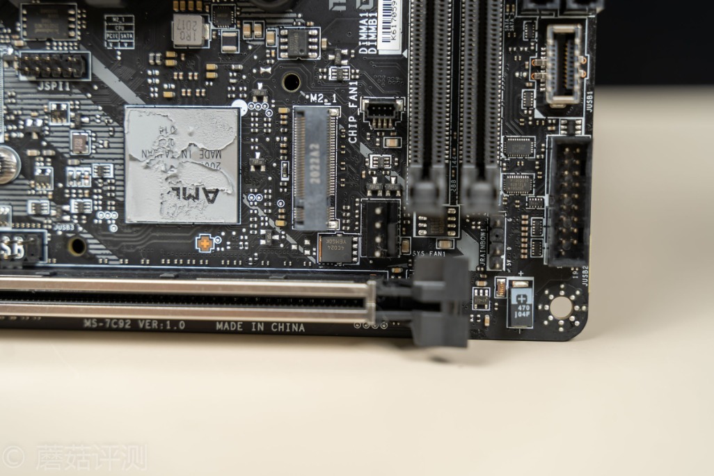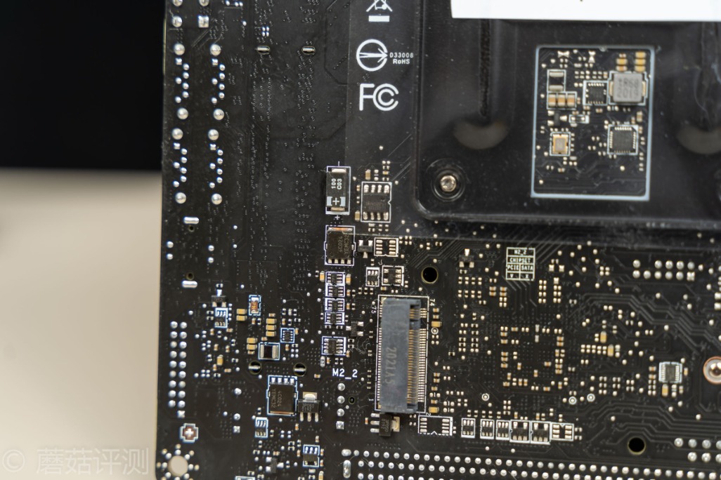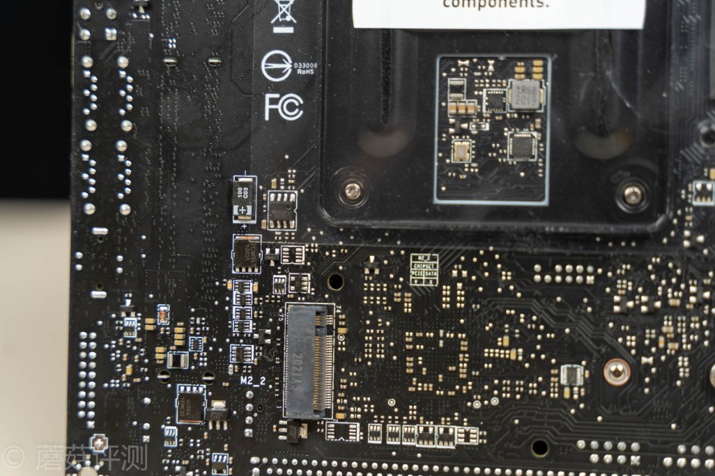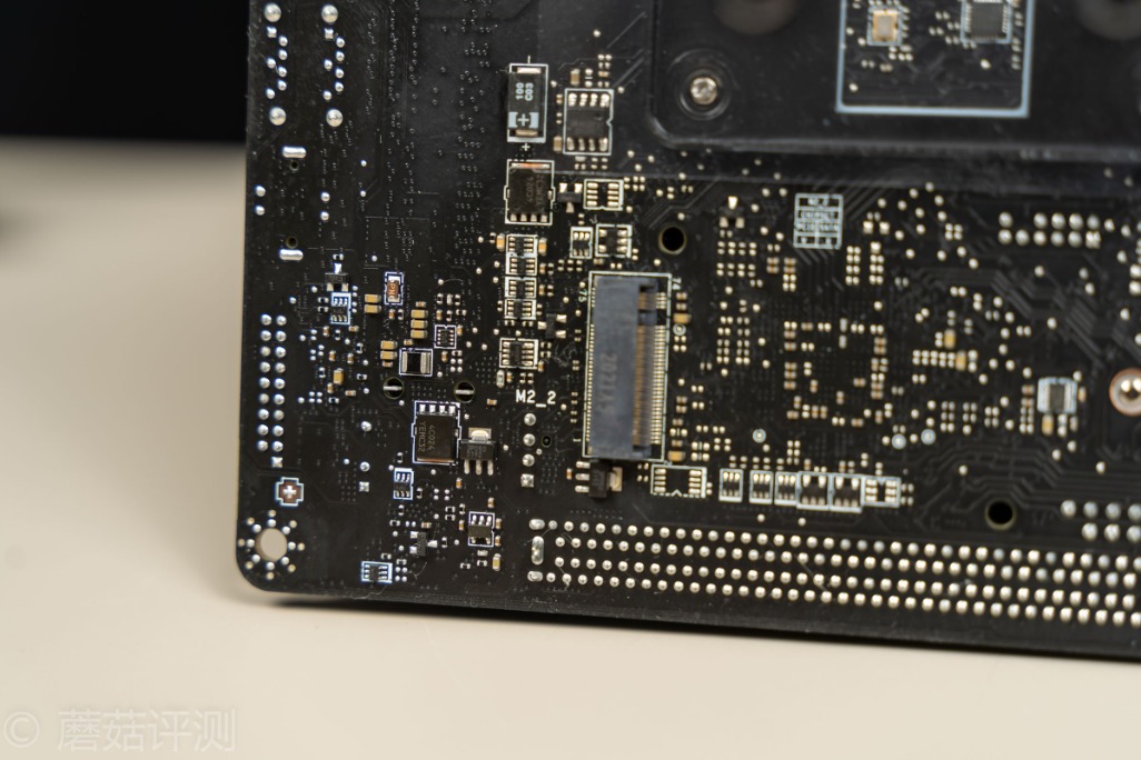 ▼下面还有一个M2插座,右侧是音频部分的物理分割线,在这么小的板子上,微星依然做音频部分的物理屏蔽分割,有点细节的,保证音质