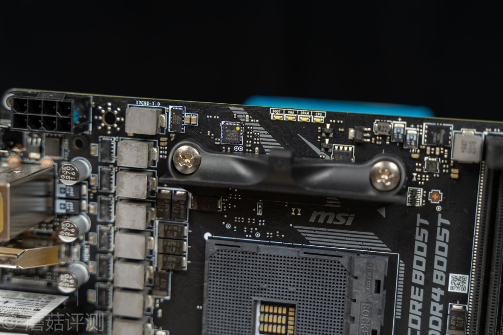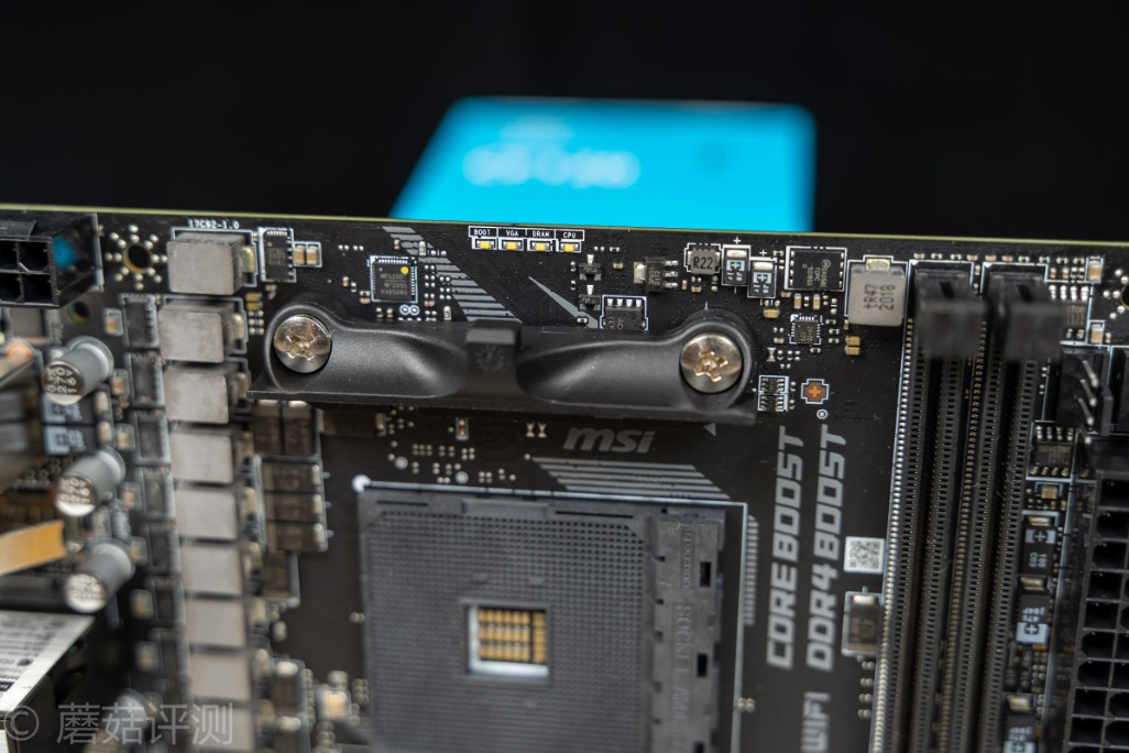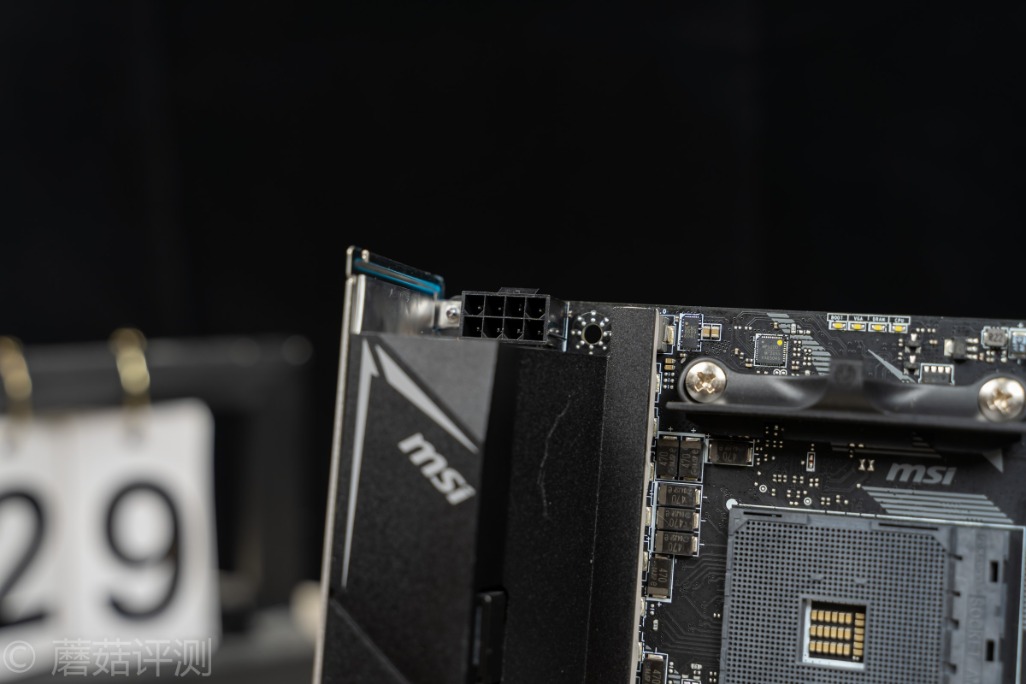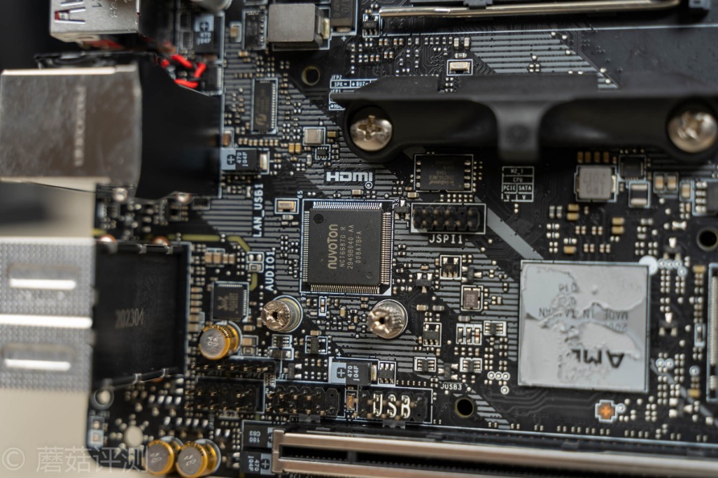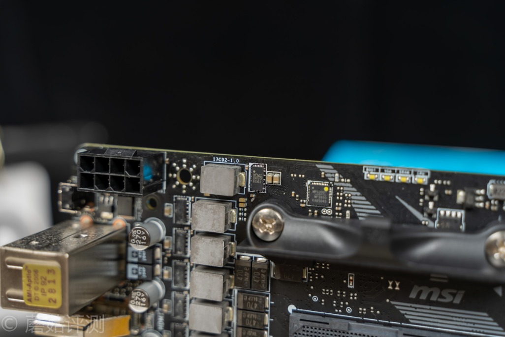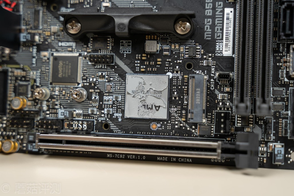 ▼AMD的B550主板南桥很漂亮,微星这里用了硅脂导热,左上角是Bios芯片,正上方是供电部分