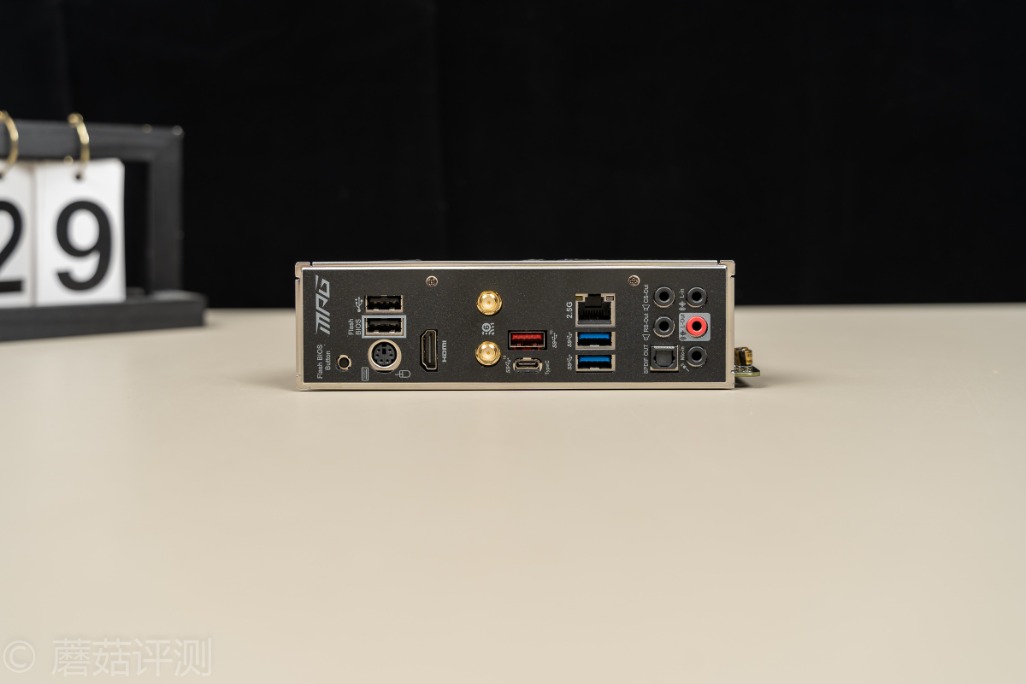 ▼主板的IO面板部分,从左到右依次是刷写Bios按钮、USB2.0接口两个(其中一个支持快速刷Bios)、PS/2鼠标键盘插口、HDMI接口、Wifi 6天线接口、USB3.2 Type-C和Type-A接口、USB3.0接口两个和2.5G的Lan口,最右侧是六个音频接口,包括光线输出