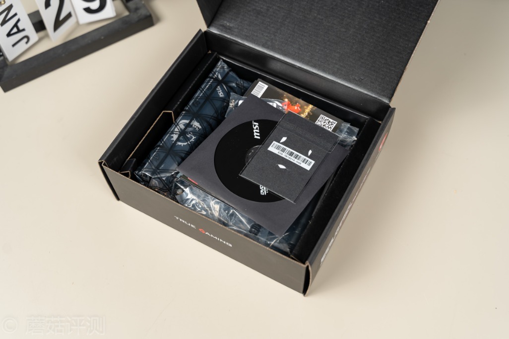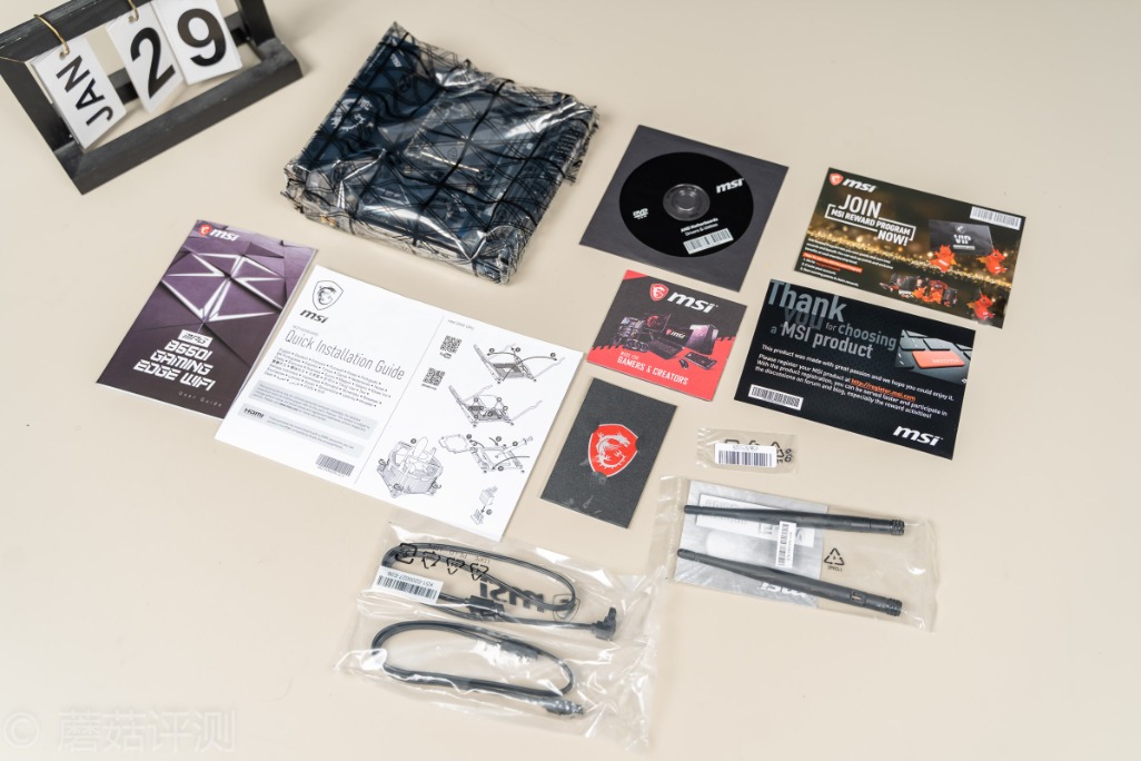 ▼除了主板和各种说明文件之外,还有SATA线两条、Wifi天线两根、微星龙盾LOGO一个