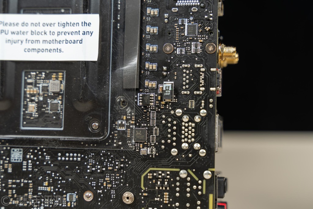▼右侧可以看到两个风扇的供电插座,微星的用料细节做的还是挺不错的,每个风扇插座都配了一个专门的驱动IC,然后仔细看,可以看到板子上有很多钽电容