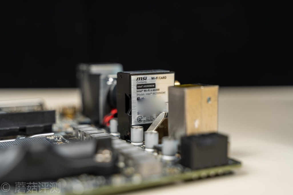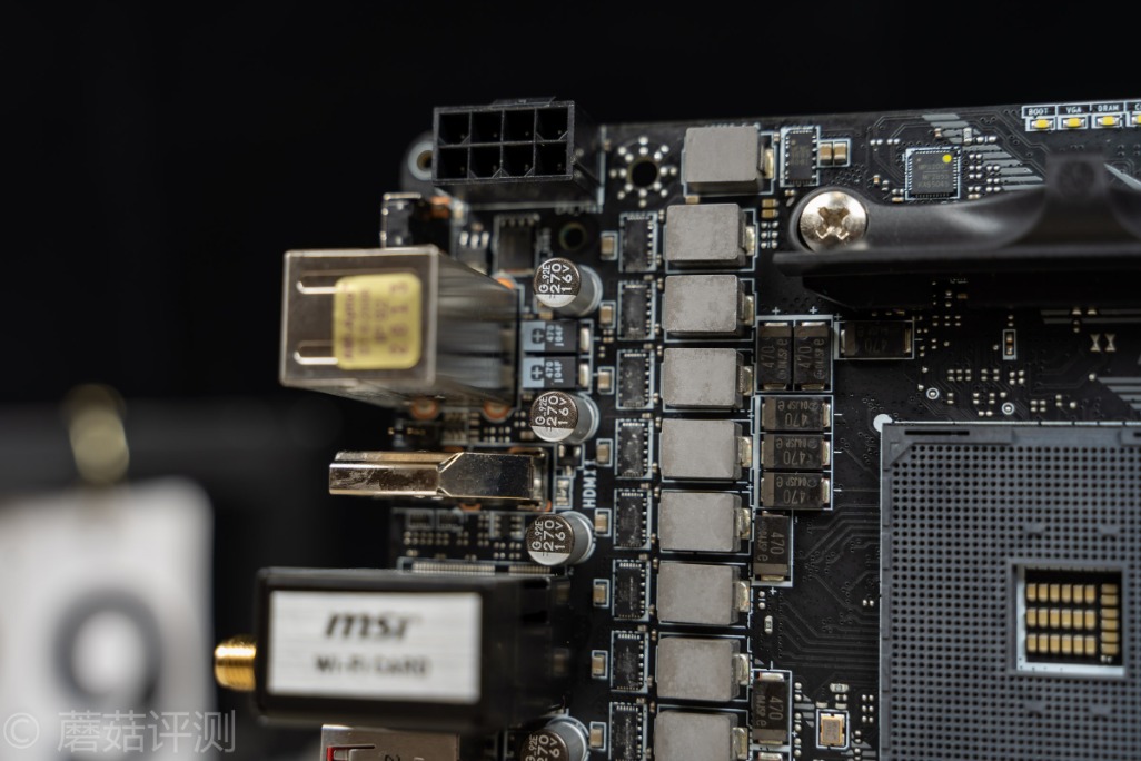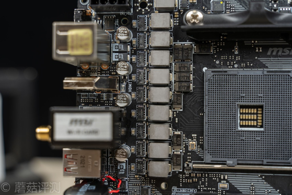 用料方面,微星这块B550I采用了8+2+1的供电配置,全部都是DrMos,清一色的最大电流60A的定制的小封装的DrMos。并且电感是微星定制的第三代钛金电感,电容在高压侧是固态电容,低压侧是松下的铝聚合物电容,另外,在特殊位置,还大量的使用了电气性能更加优秀的钽电容。在主板的各个地方,均能看到Mos管供电,整体的用料非常夸张。