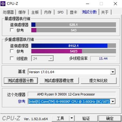 ▼跑一下CPU-Z的性能测试,单核528.1、多核8152.1,性能非常强大