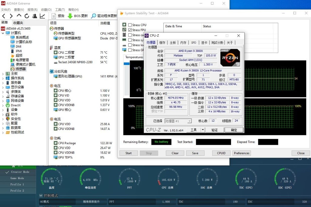 ▼接着跑CPU-Z的压力测试,3900X的核心温度在71℃左右波动,功耗在120W左右