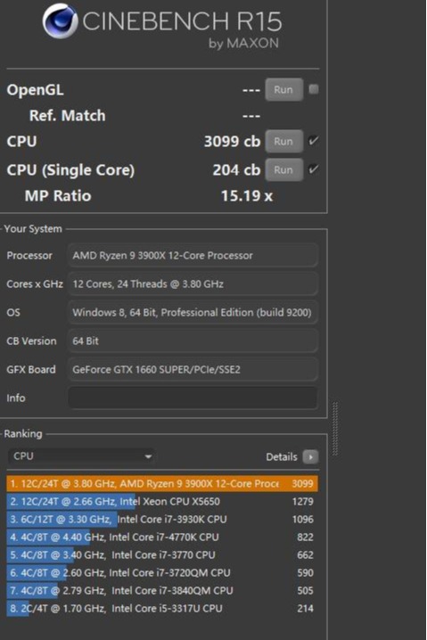 ▼R15测试,单核204、多核3099,多核性能超过3K,有点厉害的,并且跑测试的速度超快,24个框框同时在渲染
