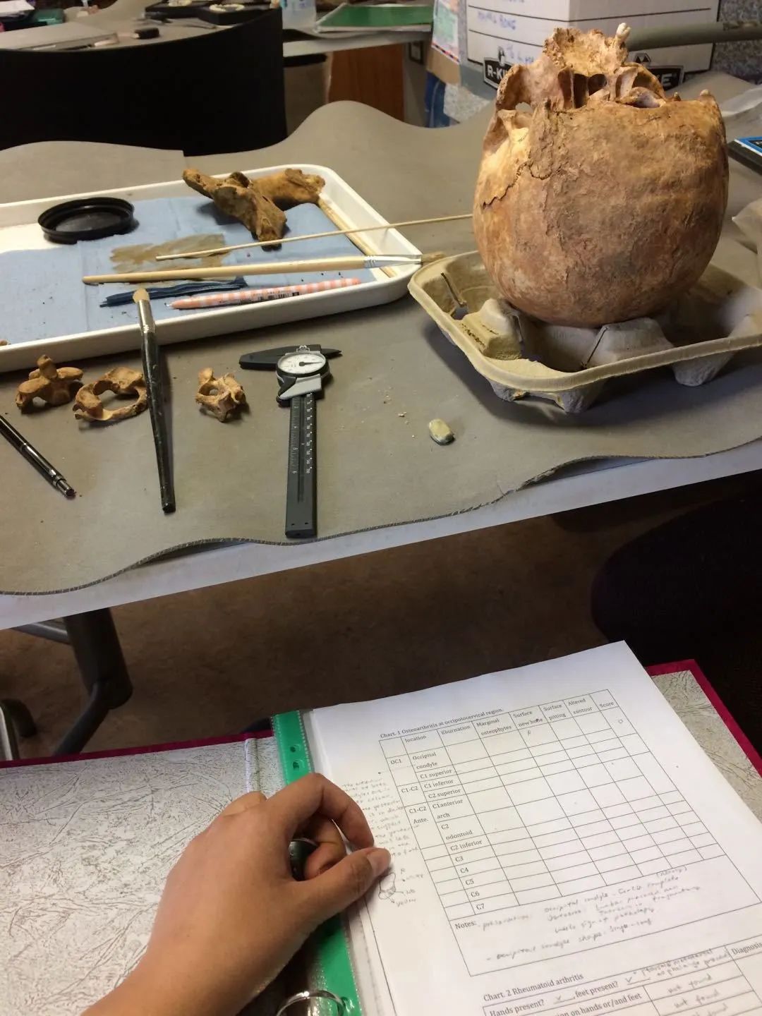 Vicky正在给某个个体的头骨和颈椎做测量、记录丨Vicky提供