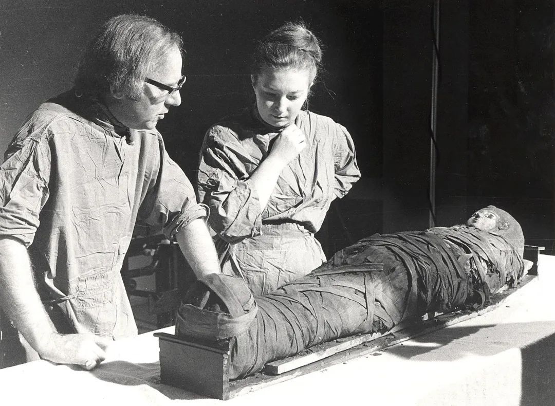 埃及学家罗莎莉·大卫和病理学家埃迪·塔普博士在1975年检查1770年的木乃伊丨Manchester Museum
