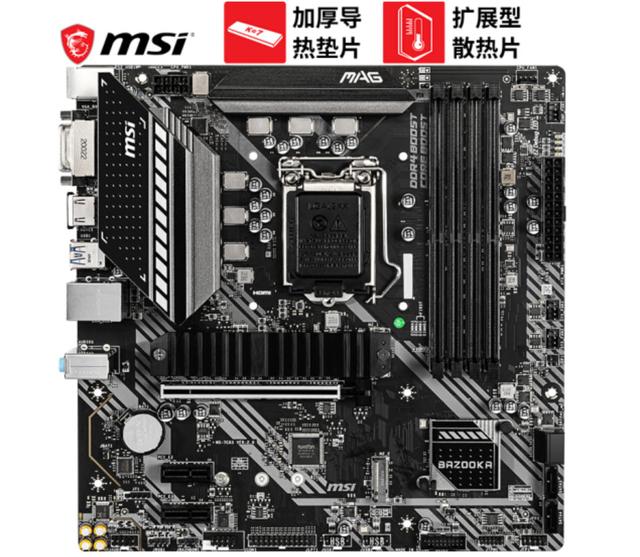 主板方面,i5-10400由于接口类型更改为LGA1200,因此需要搭配全新的400系列主板,最佳搭配是B460主流芯片主板。主板选用的是微星MAG B460M BAZOOKA火箭筒,基于Intel B460芯片,采用M-ATX小板型设计,搭配迷彩外观,全新的LGA1200处理器底座,目前仅支持第十代英特尔酷睿处理器。8相供电设计,四根DDR4内存插槽,最高128GB容量内存,内存频率最高支持到DDR4-2933MHz。