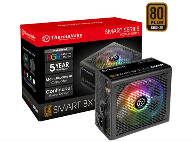 电源推荐Tt Smart BX1 RGB 550W 电源。它是Tt旗下一款主打RGB灯效的入门级电源产品。作为电源的基本属性是额定功率550W,转化率通过80PLUS铜牌认证。散热的RGB风扇搭载了10颗LED灯珠,7种灯色可以支持3种灯效,对于喜欢机箱侧透光的朋友有一定的吸引力。