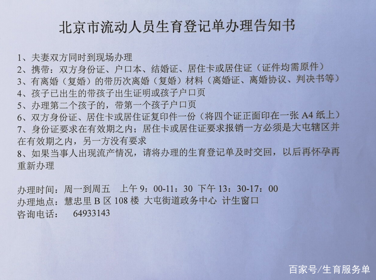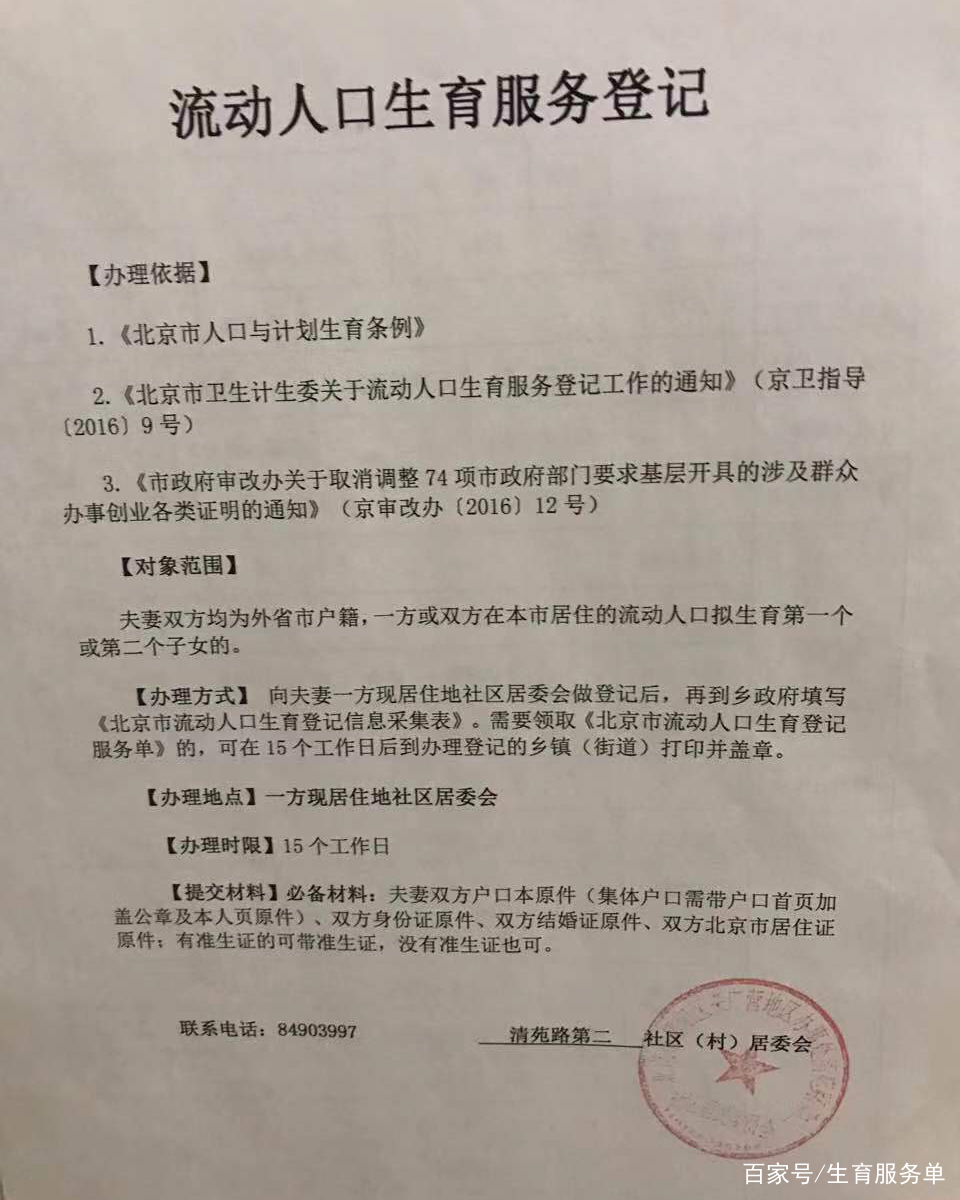 办理流程:向夫妻一方现居住地乡镇(街道)提出申请,填写《北京市流动人口生育登记信息采集表》。需要领取《北京市流动人口生育登记服务单》的,可在15个工作日后到办理登记的乡镇(街道)打印并盖章。