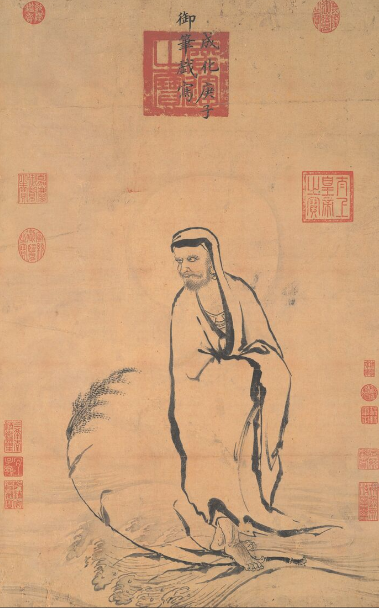 这是明宪宗朱见深绘制的《达摩图》,描述的是达摩“一苇渡江”的故事。传说,达摩曾会见梁武帝,武帝不无自得地问道:“我自即位以来,写经、造寺、度僧无数,功德如何?”达摩却答没有功德。真正功德是净智妙圆,体自空寂,无法用世俗的方法求得的。与达摩几番对话下来,武帝始终不得要领,两人面谈不契,竟不欢而散。后来,梁武帝在宝志公禅师的开示有所悔悟,即刻派人追回达摩。在江边,达摩见有人赶来,随手便折了一根芦苇投入江中,化作一叶扁舟,飘然过江,北上而去。这就是“一苇渡江”的故事。