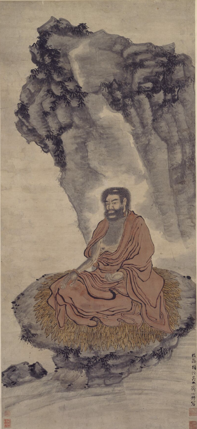 传说中,达摩“一苇渡江”之后,在北方开始了长达九年的面壁参禅,这一题材亦常常出现在中国古代的禅意画中,比如这幅明人吴彬绘制的《达摩图轴》,描绘的就是这一画面。