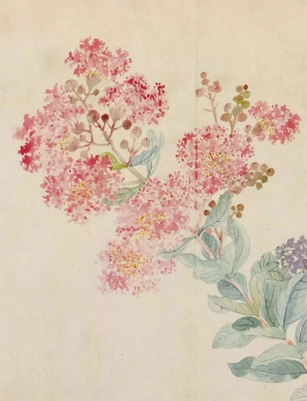 此页画两色紫薇化碎为整,后以重色提点位置关系,平中见奇,有“于无声处听惊雷”之效果。