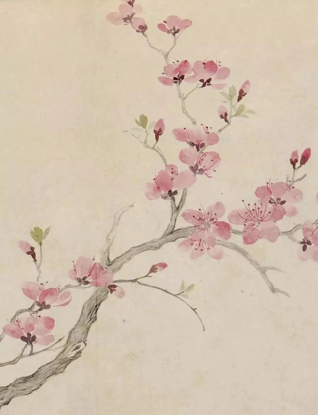 此页杏花用色颇见恽寿平手段之高明,其色彩变化丰富且层次过度自然和谐;花开俯仰向背、左右顾盼,姿态各异。干笔淡墨勾皴枝干,收笔处见精神。题为“唐六如旧本”。