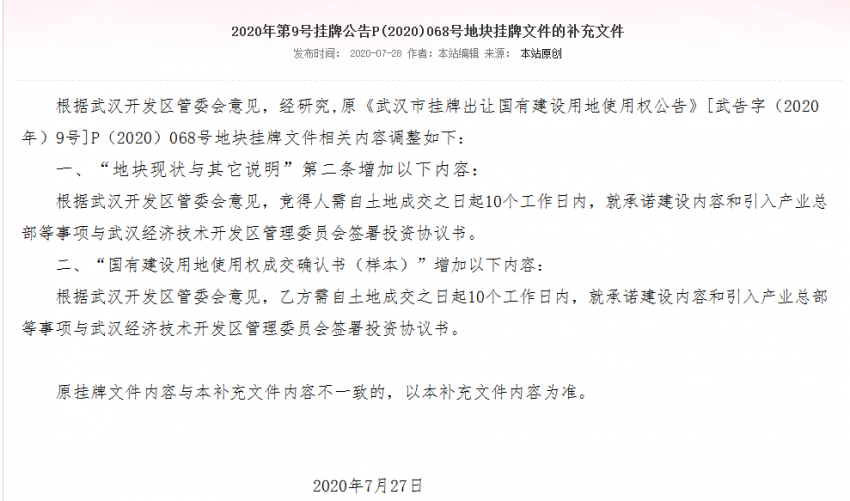 7月28日,官网发布了一则该地块的补充文件显示,增加了两项内容: