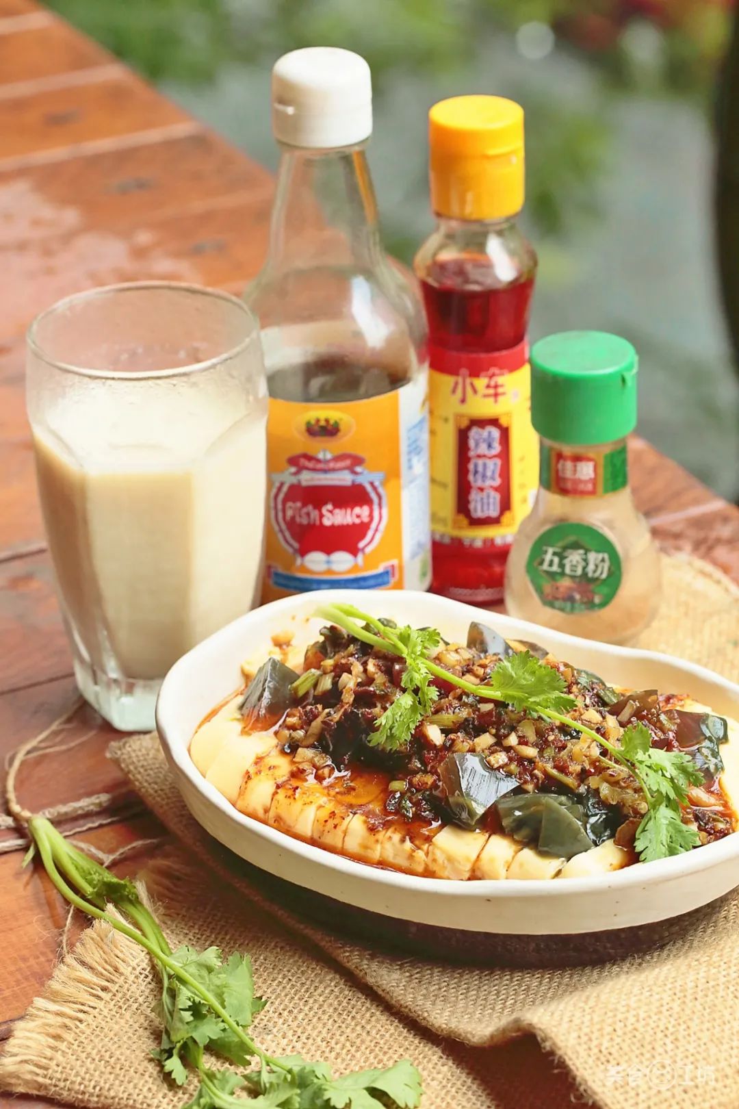 5. 葱花、蒜末、生抽、陈醋、香油、糖、油泼辣子煮成料汁,淋上皮蛋豆腐上面,拌匀即可使用。