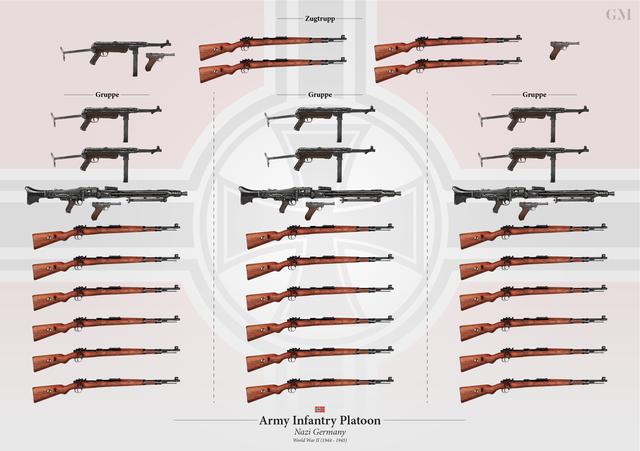 MP40正式进入德军步兵班是在1940年,当时每个步兵班的班长配发一把,另外就是98K和MG34/MG42了。而等到1943年,德军在步兵班里又增加了一把MP40,这样德军步兵班里就有了两把MP40,。