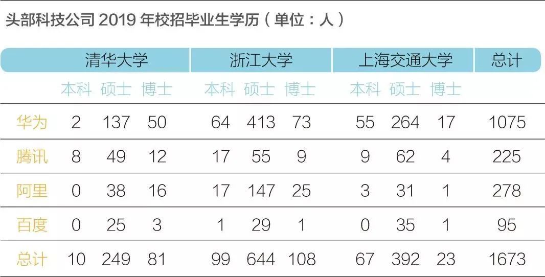 清华、浙大、上交三所高校,均披露了企业招募应届生的学历分布,其中,华为、BAT四家企业,均主要以招聘硕士研究生为主。比如,华为共招募1075人,其中硕士学历毕业生占75%,特别在清华,录取189人仅有2名本科生。