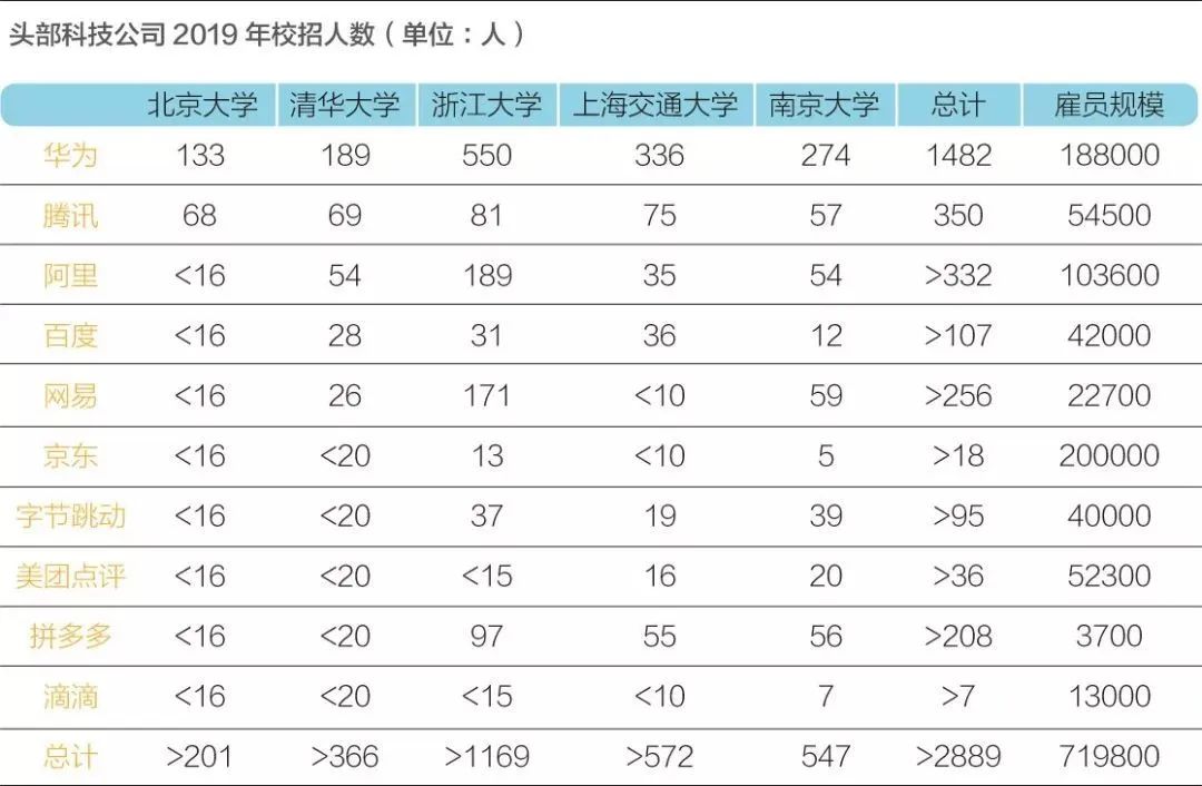 单单浙江大学,华为就招募了550人,浙大2019届毕业生总数为11948人,扣除出国深造或境内升学的毕业生,只有7369 人实际就业,等于说,每14个找工作的浙大毕业生,就有1个人去了华为。