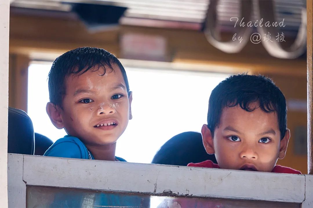 车上两个天真的小朋友,好奇地打量着站台上的乘客们。脸上抹着白白的粉末,大概是防晒的,看上去可爱极了。