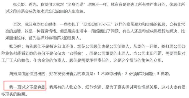 我比较不能理解的一点是张英姬所说的“这不是爽剧,我所有的人物立体,细节饱满,为了真实探讨两性情感关系”,我不否认细节的用心,但在出轨的同时烟花厂发生爆炸几率能有多少?编剧没有考虑观众的感受,而将顾佳放置在受伤最深的位置上。