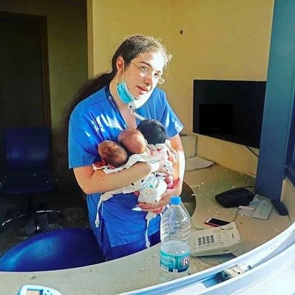 医生Nayef 5日凌晨在社交媒体上分享了一张同事的照片:这位护士怀里护着3个婴儿。