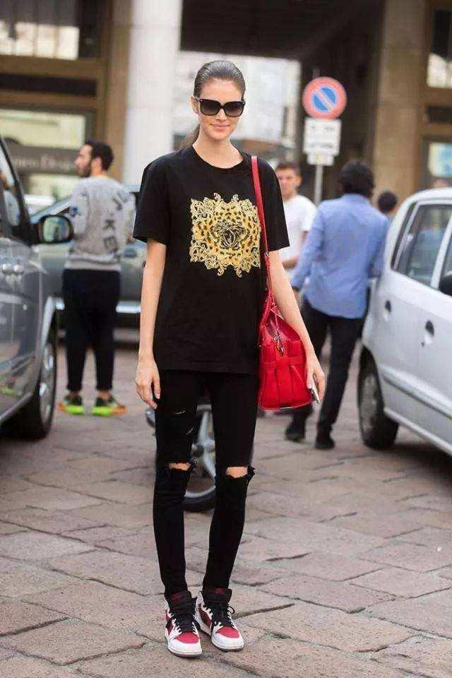圆领设计的印花黑色T恤,短袖设计穿着舒适清爽,宽松的版型适合各式不同的身形。衣服底摆自然垂坠,搭配破洞设计的小黑裤,时髦指数也在无形中攀升了起来,搭配红色拼接的运动鞋,时尚而又简洁大方,一个红色的斜挎包包,也为整体穿搭带来吸睛点。