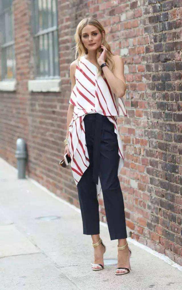 在夏天小黑裤也是一样很受欢迎的,穿起来舒适大方,且还十分的美观。搭配撞色拼接的高跟凉鞋组合起来,显得时髦又性感,上衣是一件红色条纹休闲的小衫,无袖的剪裁,穿起来清爽而又自在,衣摆是不规则的设计,时髦的感觉也是一览无遗,随意的上身就展现出满满的时尚气息来。