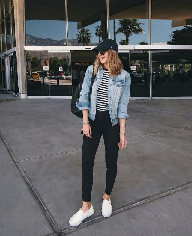 撞色条纹小衫,经典而又百搭,外面一件牛仔小外套,穿起来舒适而又写意,带来满满的休闲感。下身的黑色休闲长裤与之搭配起来,显得简洁又随性,清新的小白鞋,踩出活力俏皮的味道,戴上黑色的棒球帽以及黑色的斜挎包包,不管是出街或是在其它的场景,都显得很是适合。