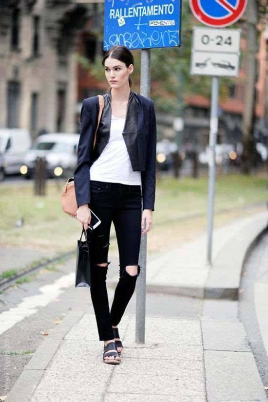 白色小衫与黑色的夹克短外套组合在一起,时尚而又简洁大方,带来满满的层次美感出来。而小黑裤上面,采用个性的破洞点缀,显得时髦而又吸睛,还打破了纯色服饰的单一性。脚上的露趾凉鞋,是平底的造型,穿起来舒适而又简洁,搭配一个浅橘色的斜挎包包,为整体穿搭带来时尚焦点。