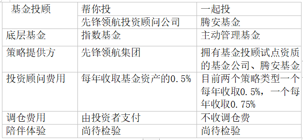 蚂蚁基金推出的“帮你投”和腾讯推出的“一起投”最大的区别在于,前者底层买的是指数基金,其中相当一部分是费率低廉的被动指数基金;后者买的都是主动管理基金。费率方面,两者都收取投资顾问费用,“帮你投”收取申购费和调仓费用,而“一起投”不收申购费和调仓费。至于投资顾问最关键的“顾”的部分,由于目前推出时间都还比较短,还有待投资者检验。