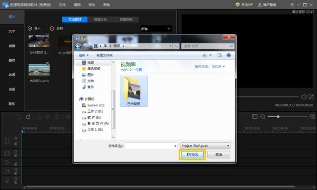 运行软件,会有一个黑灰色调的软件页面出现。进入软件页面以后,大家先把需要添加虚化效果的视频文件给打开。点击页面【文件】-【打开项目】按键,进入文件选择弹窗。在这里,找到并选中相应的视频文件后,小伙伴们点击弹窗内【打开】按钮就可以啦。