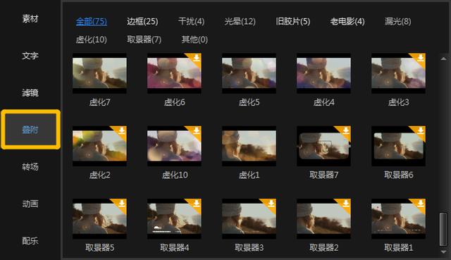 打开需要添加虚化效果的视频文件后,先对页面内容进行简单浏览。随后,点击页面左侧的【叠附】按键,进入相应素材模板浏览窗口。在其展示窗口中,大家可以浏览到很多种视频叠附素材。点击其中的【虚化】分类,小伙伴们便能够快速地找到合适、想要的视频虚化素材。