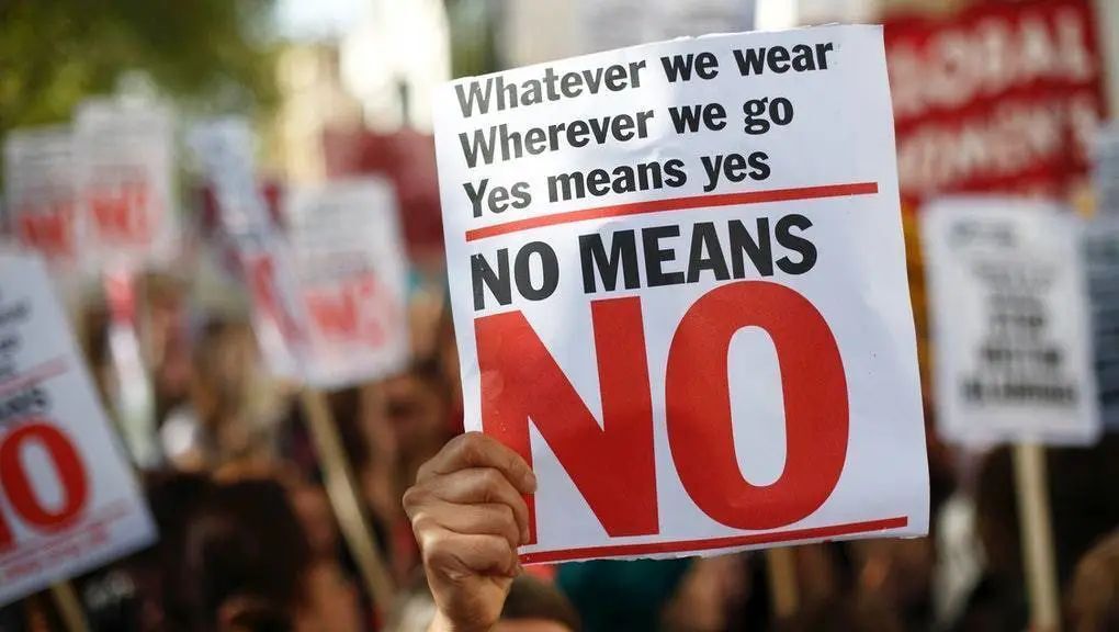 女性抗议者高举“女生说‘不’就是‘不’”的标语