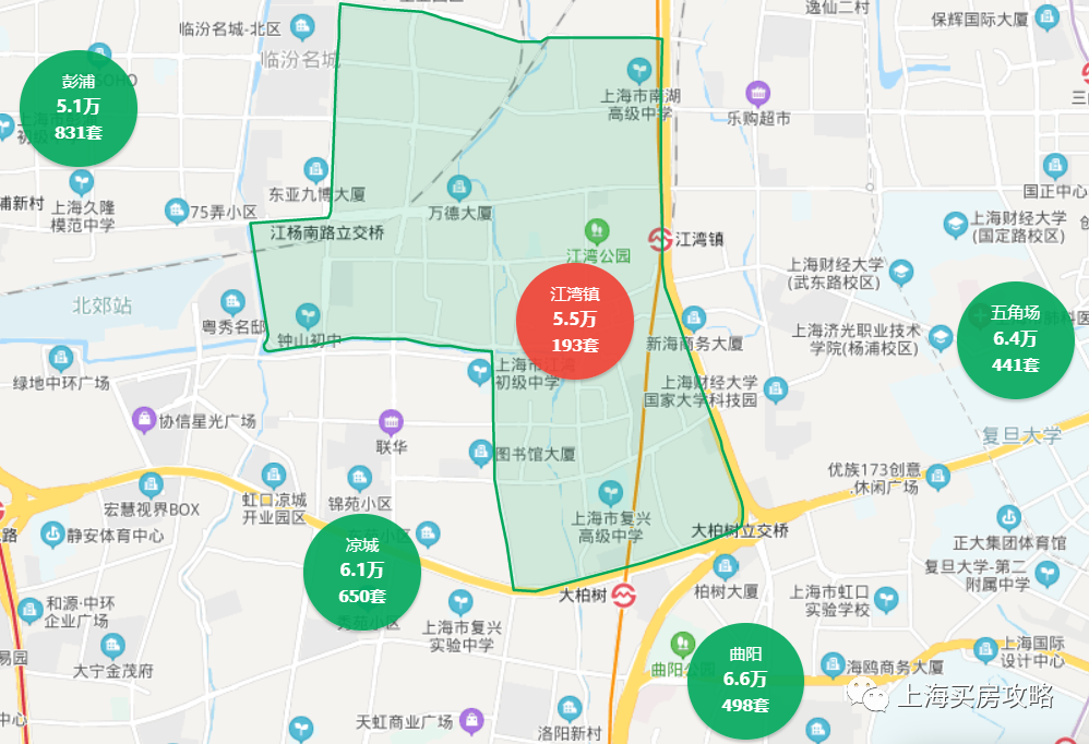 江湾镇是虹口区最北部的板块,除了教育资源尚可,有红旗小学与江湾初级中学外,没有什么可取之处,住宅基本都是老公房和动迁房。