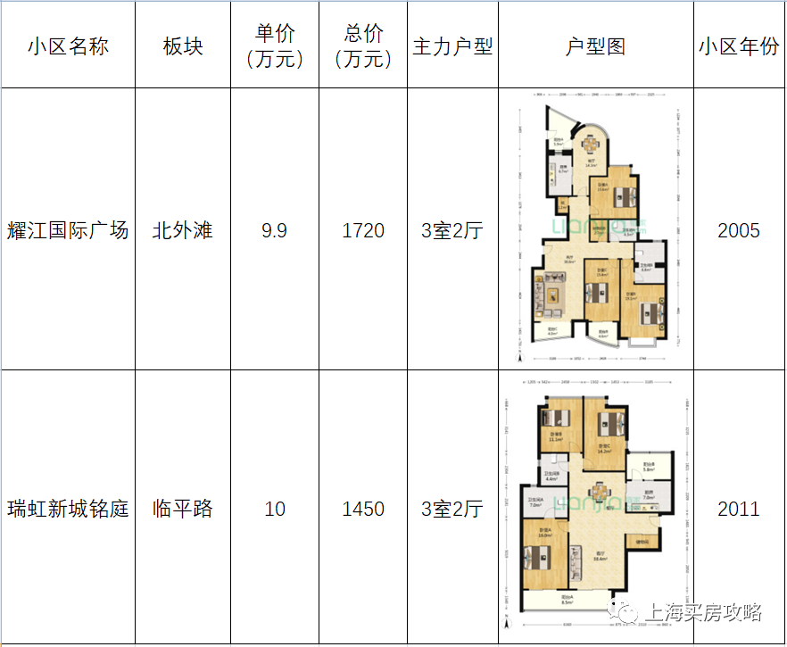 瑞虹新城其他各期与建邦16区等次新房,单价在9-11万之间,两房总价900-1000万,三房总价1300万以上。