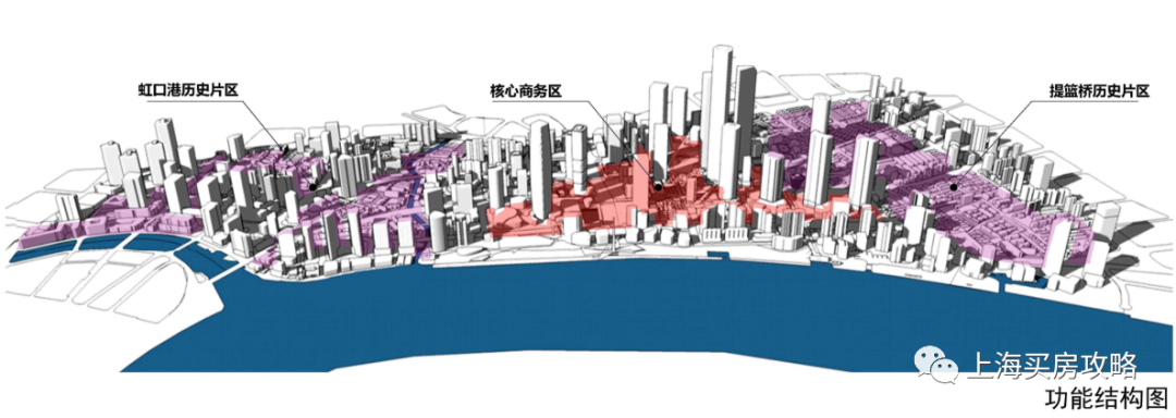 具体规划上,中部商务区将进行高强度、高密度开发,两侧提篮桥、虹口港历史片区将形成低层高密度空间格局,全域构建新旧融合、以人为本的公共空间网络。