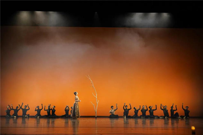 在舞台中央树立的一棵树,仿佛是为了纪念逝者所立的墓碑,而在树前或穿行或奔跑的人,代表着一片片,从树上飘落的形状不同、纹路各异的树叶。希望可以借落叶之景,去缅怀与纪念所有在这场疫情中逝去的生命。