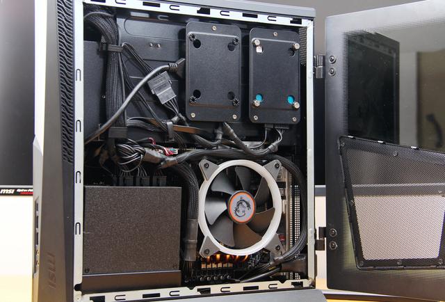 主机基于黑色的主色调设计,多处布置的通风散热通道与外观设计达到了很和谐的效果。通电开机之后,微星海皇戟X的正面、顶部和两个侧面甚至乃至后面均有绚丽的RGB灯效,并且可以通过内置的软件控制多种灯光效果。并且左右侧板在CPU、显卡及电源部分均开有通风孔,让微星海皇戟X具有最好的散热效果。