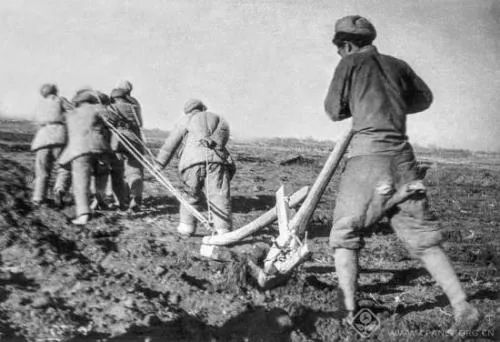 经过前期试点,松江国营第一农场在宁安宣告成立,大家伙借来三台旧火犁,两台四铧犁,茫茫北大荒在1947年8月12日这一天,正式破土。