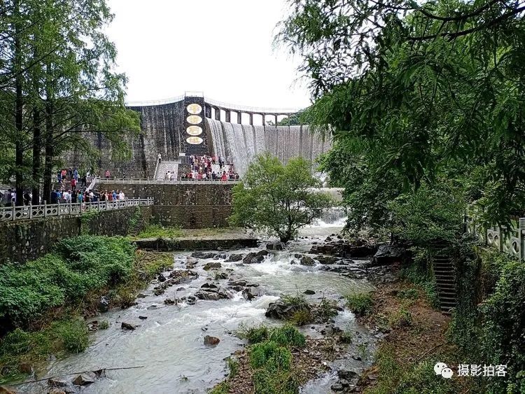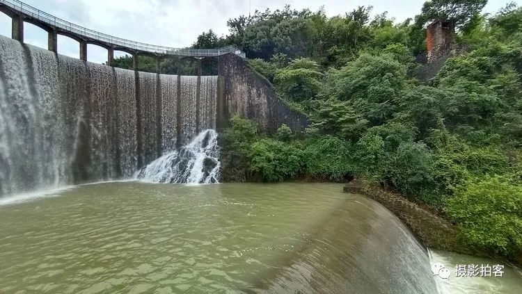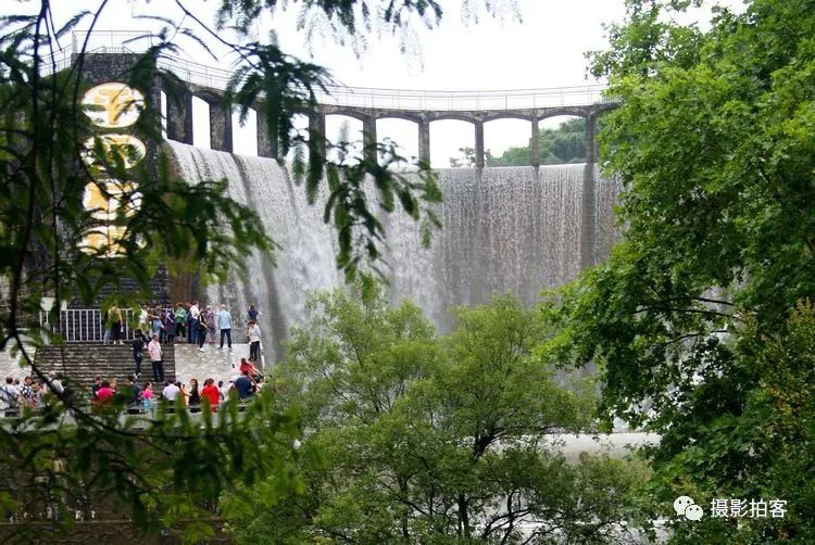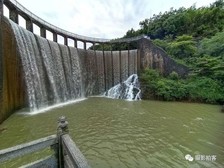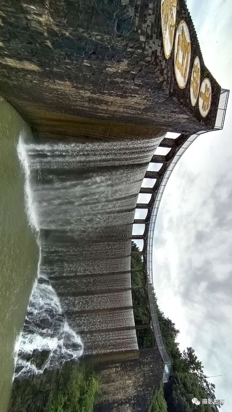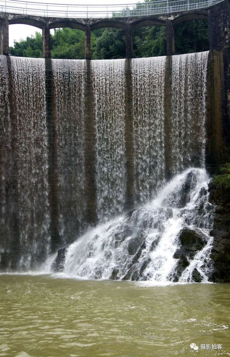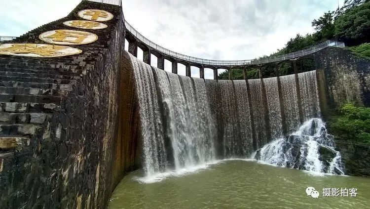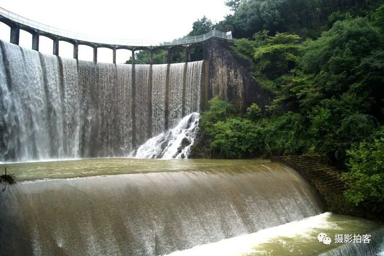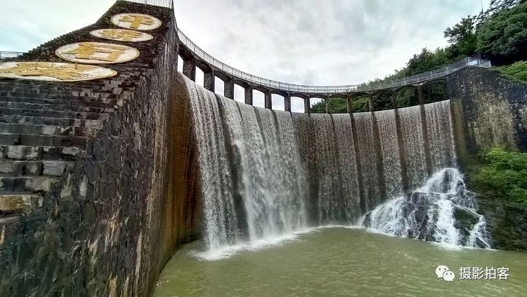 每当汛水季节,山水浩荡,库水涌动,从溢流孔中倾泻而下,形成宽约40米,高20余米的飞流瀑布,场景实为壮观。