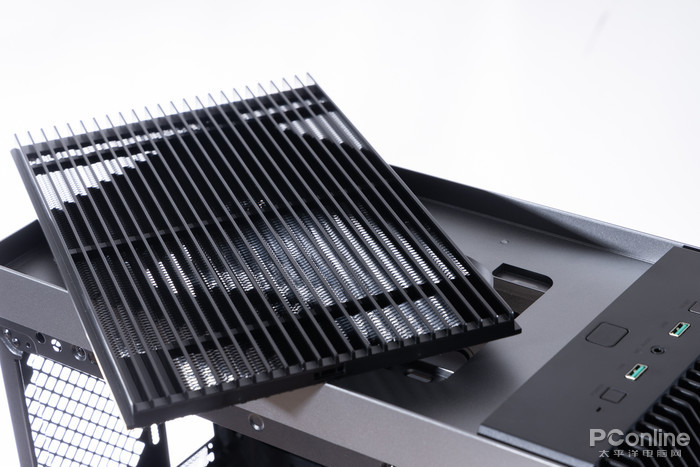 按下顶部开关,顶部的大面积网状进气格栅即可整片抽出,这种设计兼顾了防尘和散热能力,清理起来也足够方便,下方的两个孔位也可以降低散热风扇的安装难度。