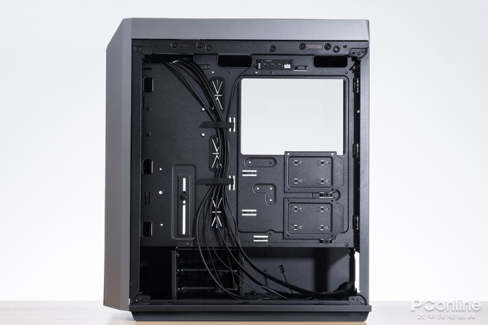 机箱的背部空间非常充足,空间深度达到23mm,除了拥有大量走线孔外,还拥有2个2.5英寸硬盘拓展位,I/O接口的连接线已经被束线带整理好,还配备了大量尼龙束线带,走线和收纳都相当轻松。