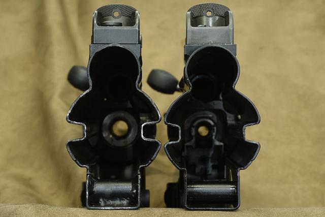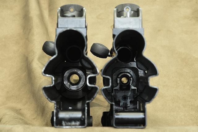 枪身内部尺寸其实是完全一样的,除了枪膛与枪管的固定方式不同,这张也能明显看出内部差异!