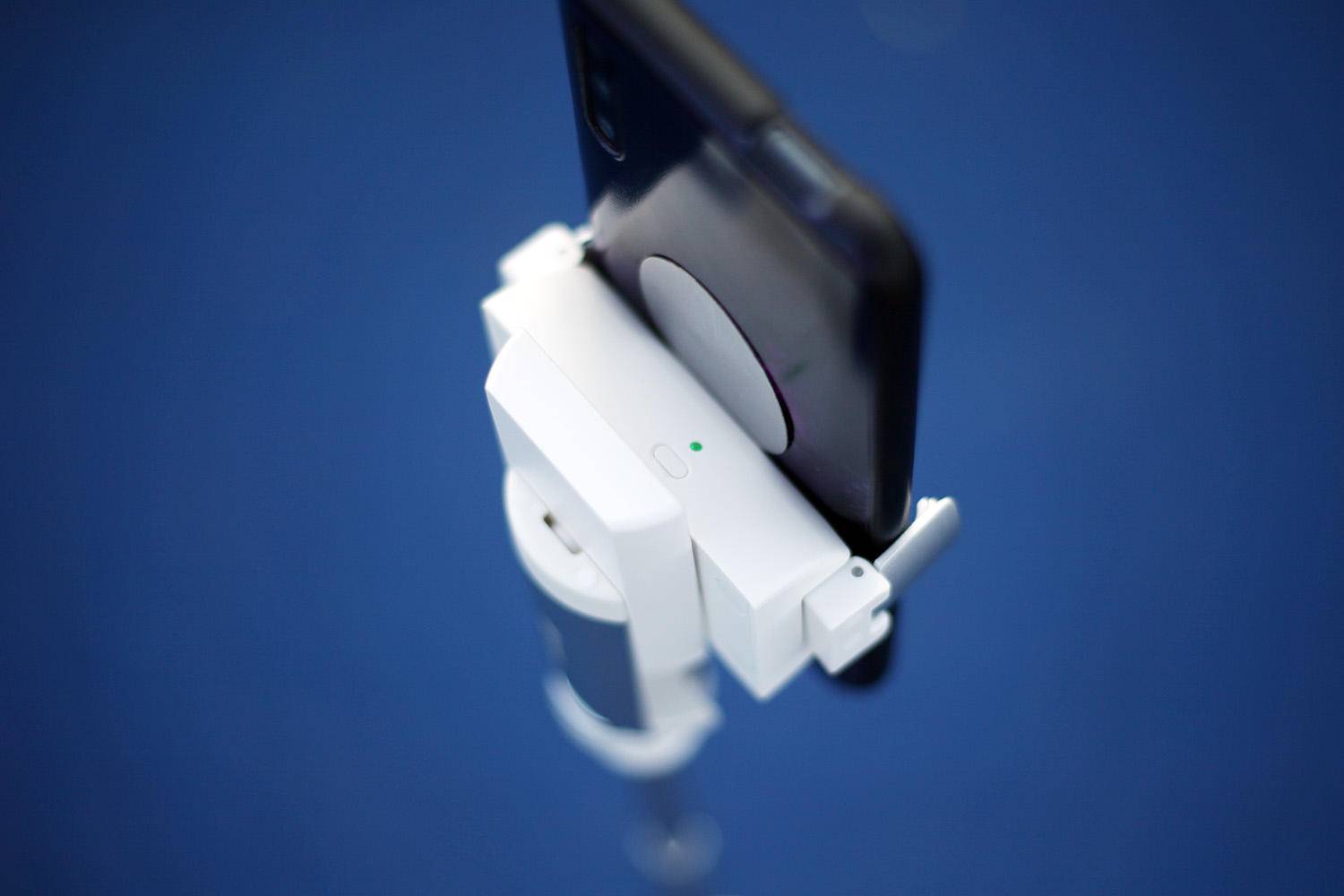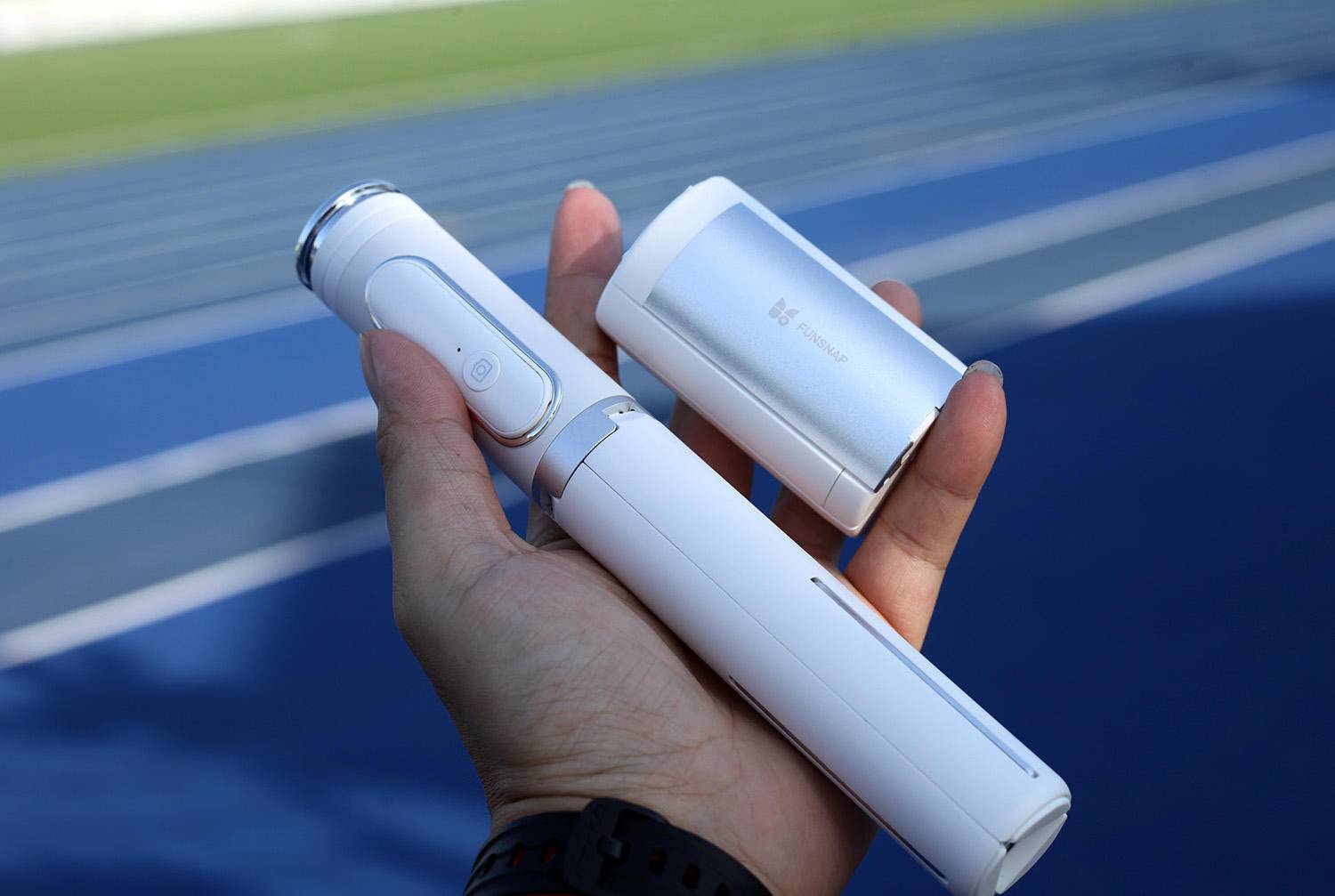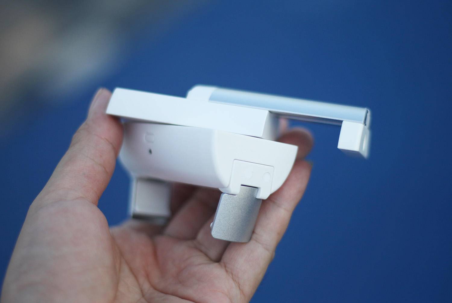 再来看看这个稳定器。虽然小巧,但是设计却也十分巧妙。它采用卡扣设计,推开以后就可以任意旋转了。稳定器采用了单轴向稳定,但融合了六轴陀螺仪数据,能够让设备始终稳定处于垂直状态。
