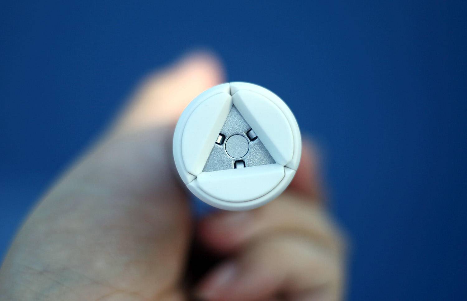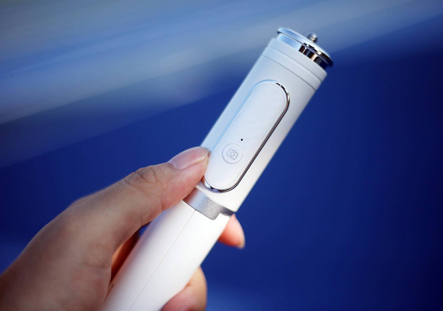 自拍杆正面是一个拍照按键,然而有趣的是这个按键居然可以拆下来。其实它是一个独立的蓝牙遥控器,可以连接手机并进行蓝牙遥控拍照操作,拥有独立的电池和充电口,这个设计很棒!