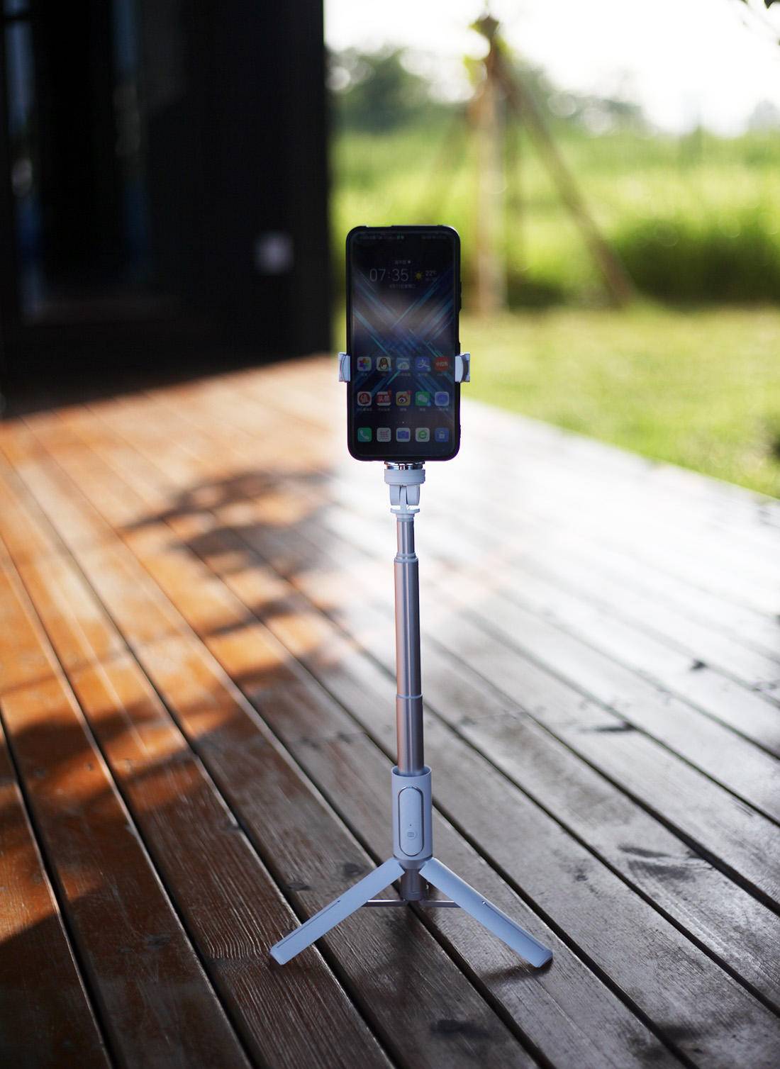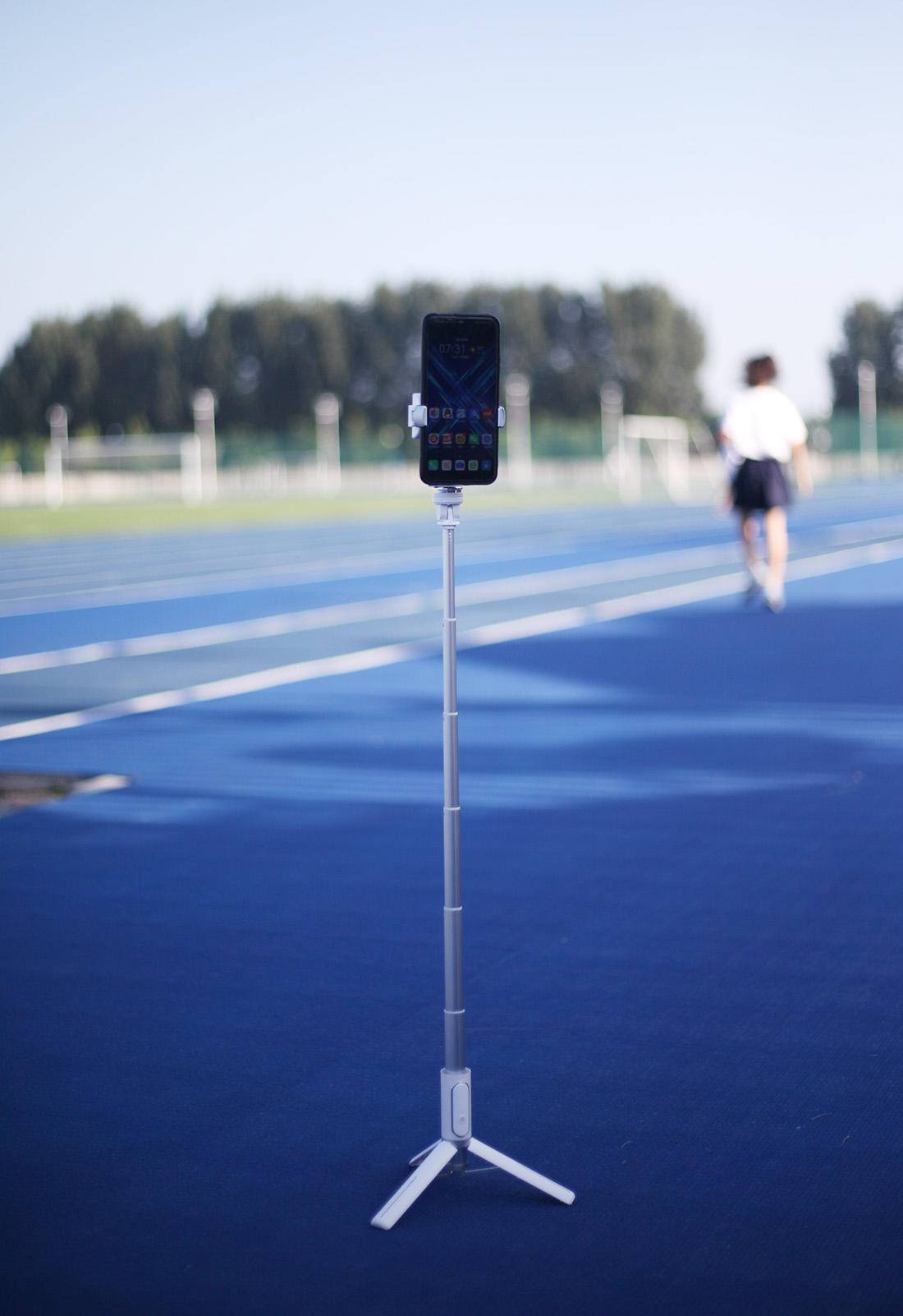 将逗映Capture Q直播稳定器完整组合并展开以后支撑在地上,就是图中的这个状态了。配合蓝牙遥控器,可以实现自拍或者进行直播。